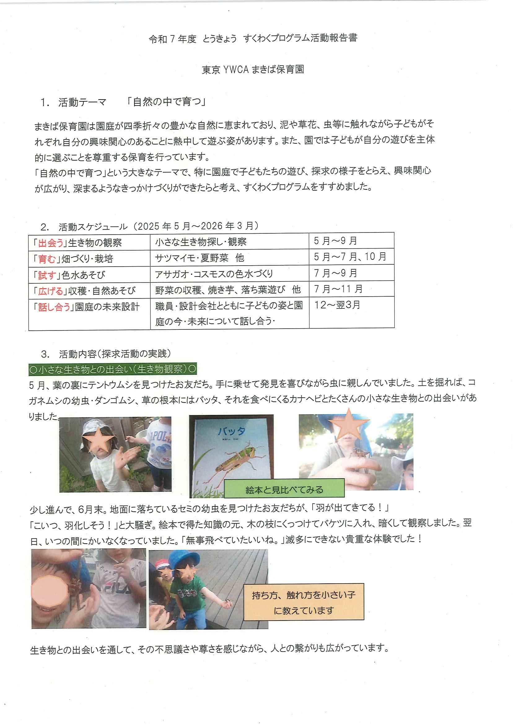 今年度、まきば保育園では、「自然の中で育つ」という大きなテーマで、特に園庭での子どもたちの遊び、探求の様子をとらえ、興味関心が広がり、深まるようなきっかけづくりができたらと考え「とうきょうすくわくプログラム」をすすめました。季節によって大きく4つのテーマに分けてさまざまな遊びを楽しむ子どもの姿を捉えて、報告致します。