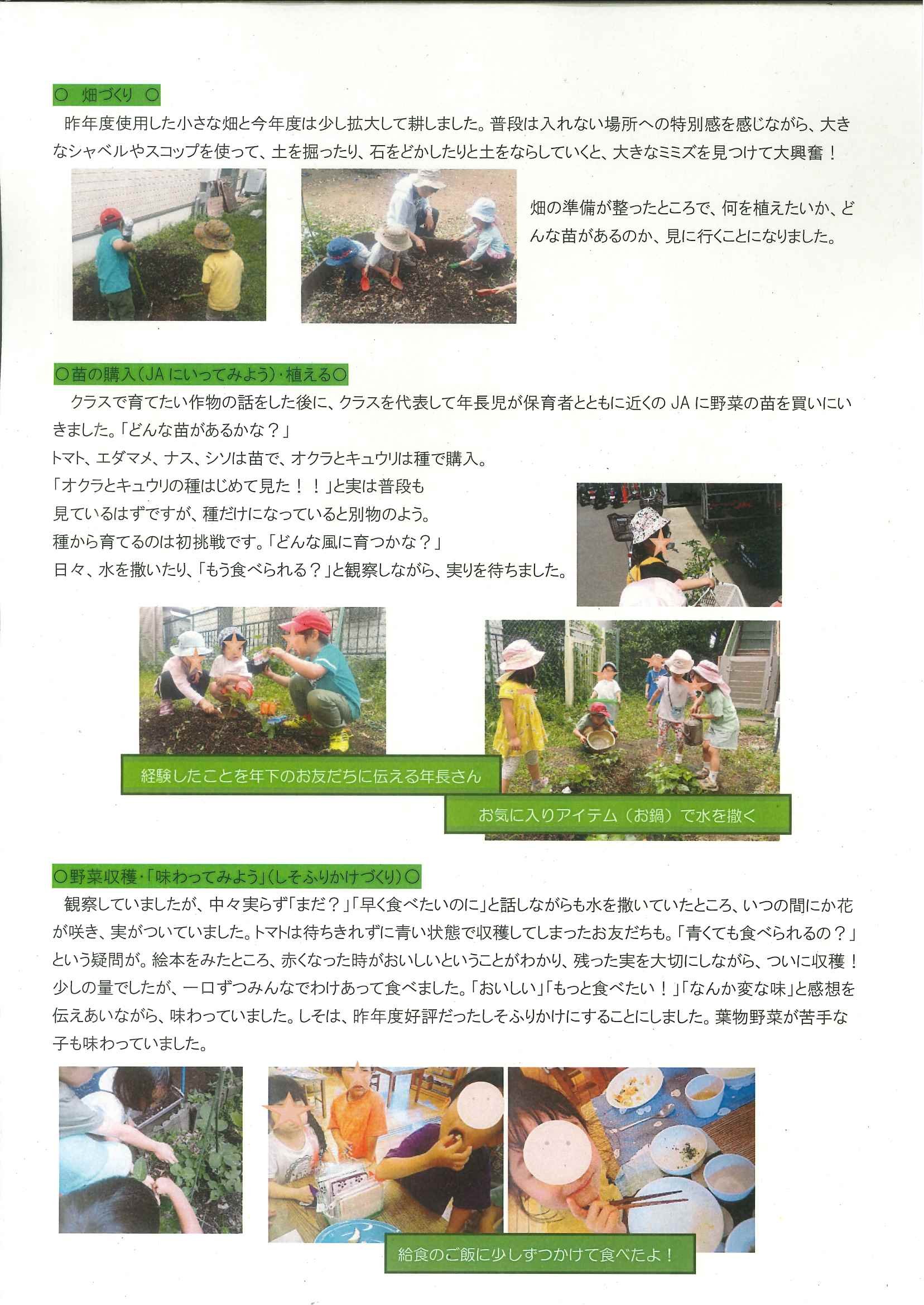 今回すくわくプログラムに参加することで、よりねらいや学んでいる様子を丁寧に振り返ることができ、保護者とも共有することができました。 今後も子どもたちの好奇心・探求心を満たし、豊かな感性と学びの場となるよう、園外の人との繋がり・手を借りながら、より一層魅力ある園庭、自然とつながる活動・環境を整えていきたいと思います。また、安全面、衛生面についての課題にも取り組み、より安心して子どもたちがいきいきと活動できるように努力していきたいと思います。