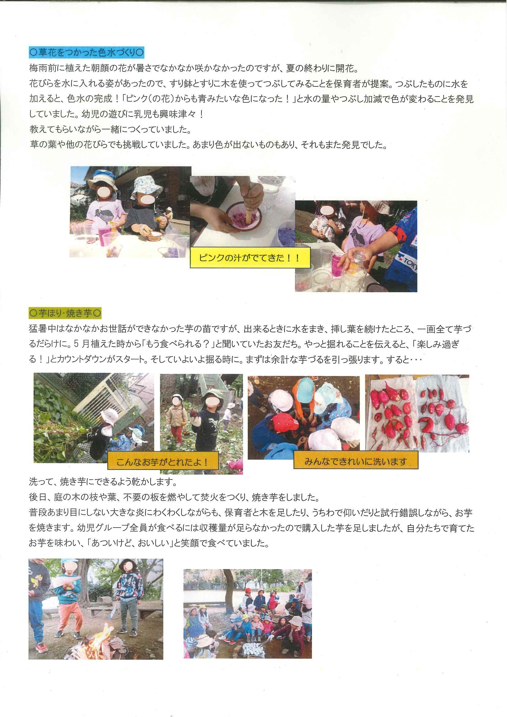 ④.「広げる」好奇心・遊びの広がり(野菜の収穫・焼き芋・落ち葉や草花の遊び)(7~11月)